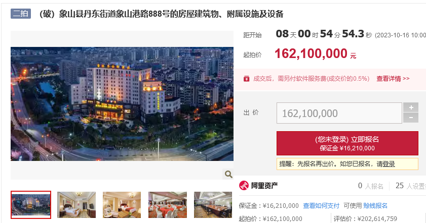 据阿里法拍官网消息,宁波四季佳利酒店所在象山县丹东街道象山港路888号的房屋建筑物、附属设施及设备将于2023年10月16日拍卖,起拍价1.62亿元,评估价2.02亿元。